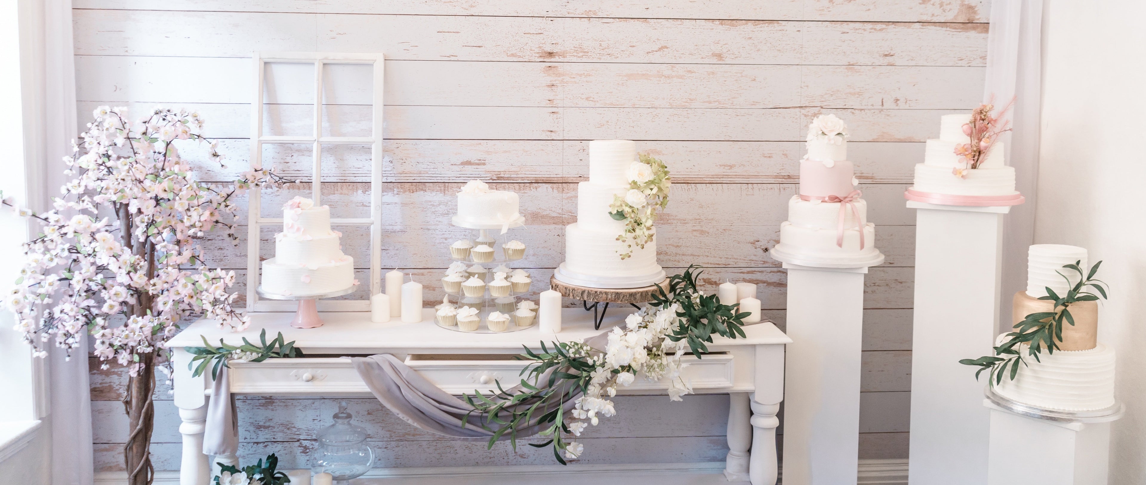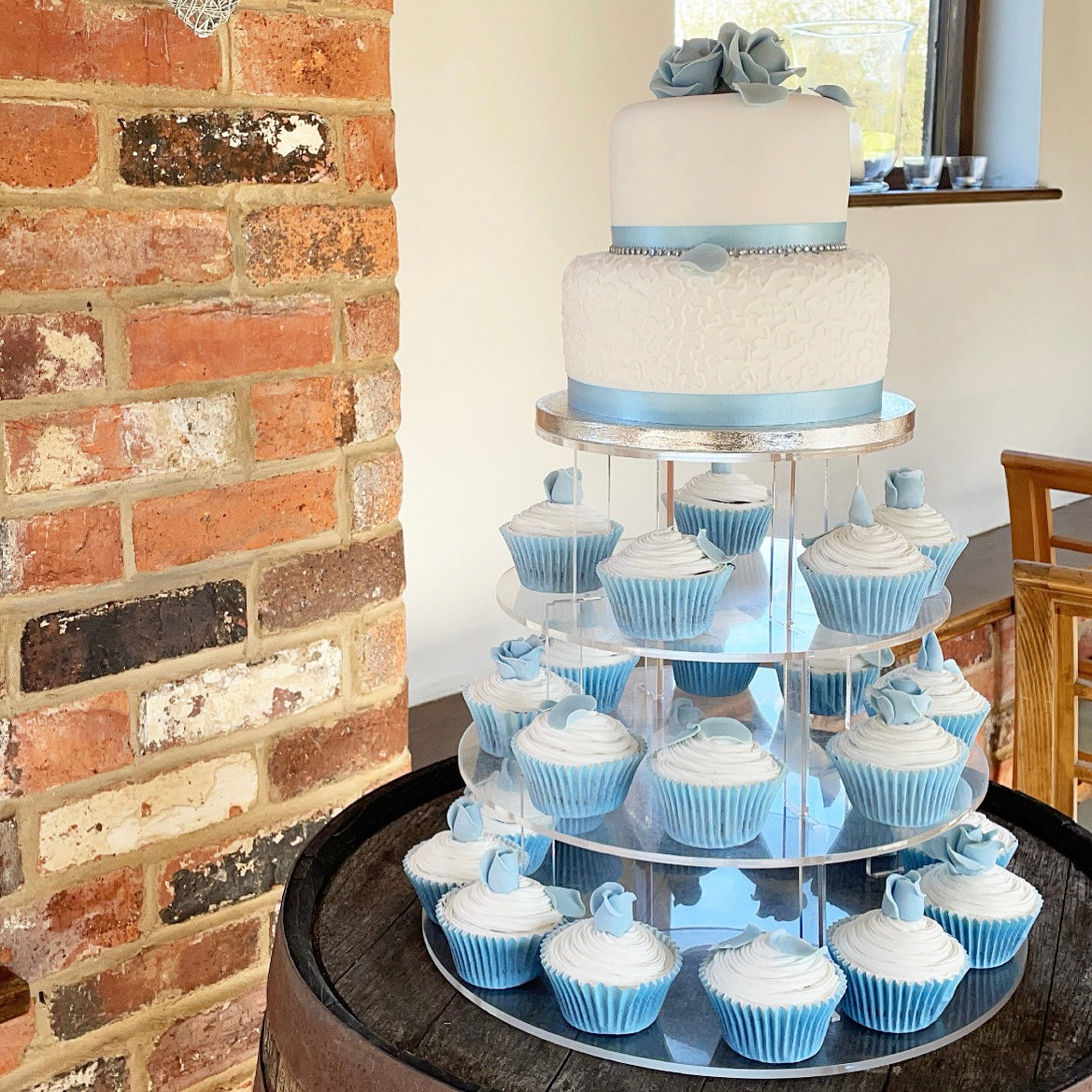 We do have a wide range of cake stands including gold/silver bases, cupcake stands, round hoops & metal tiered stands available to hire for an additional fee. We ask for a returnable security deposit, which is returned to you after you return the cake stand in its original condition to us within 3 working days of your wedding. Get in touch for more information.